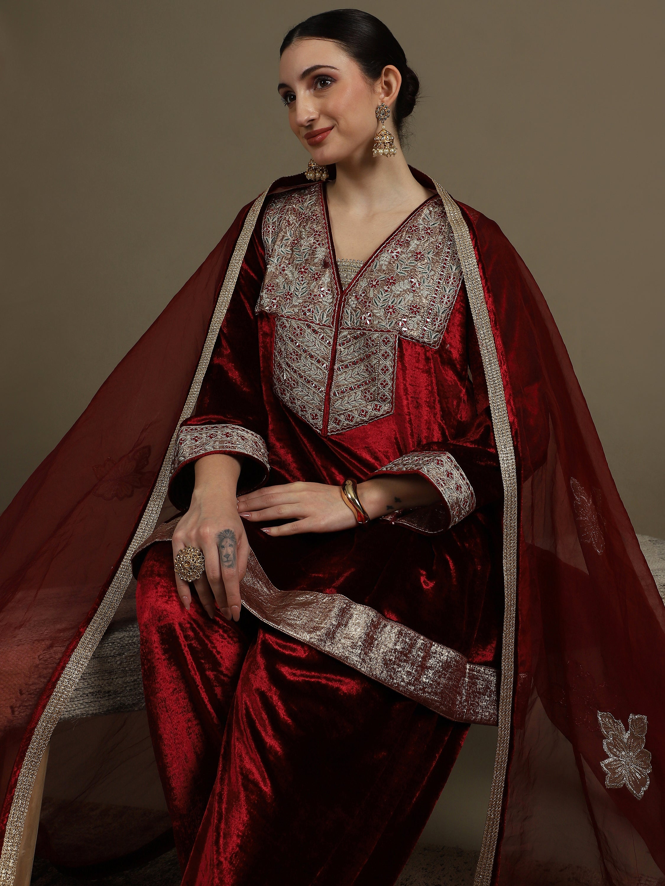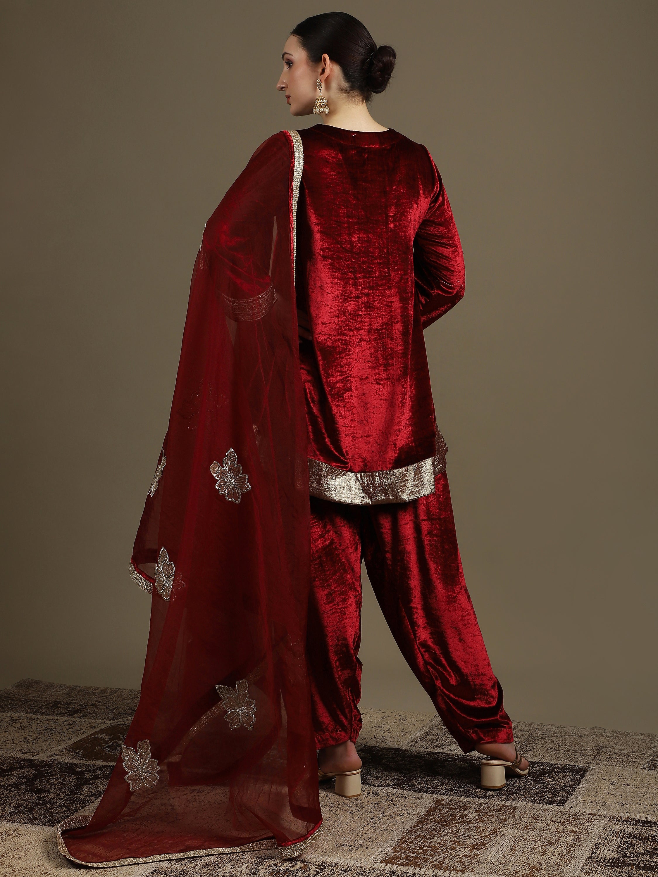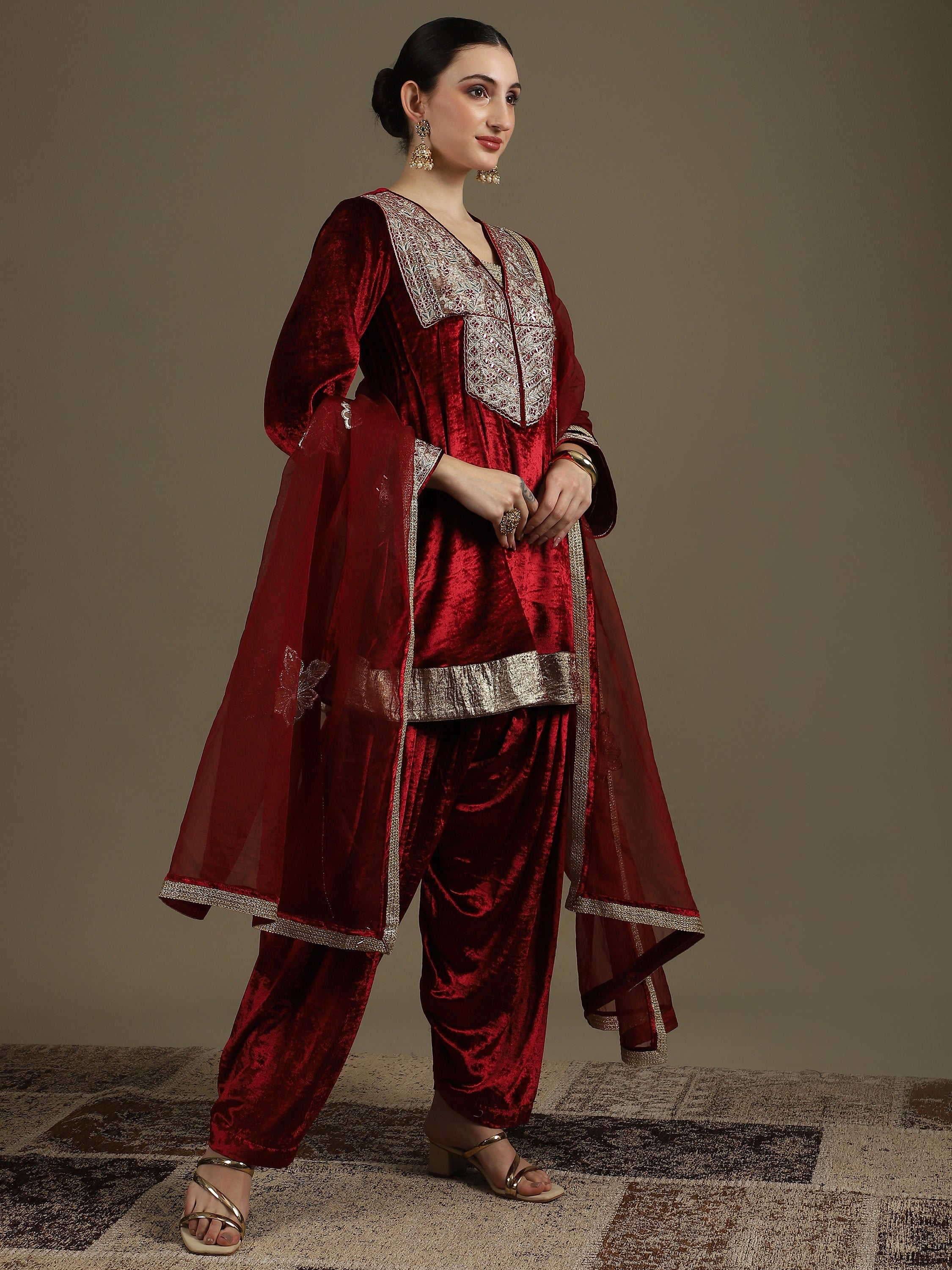 Choga Style Mehroon Farshi Salwaar Set with Dupatta